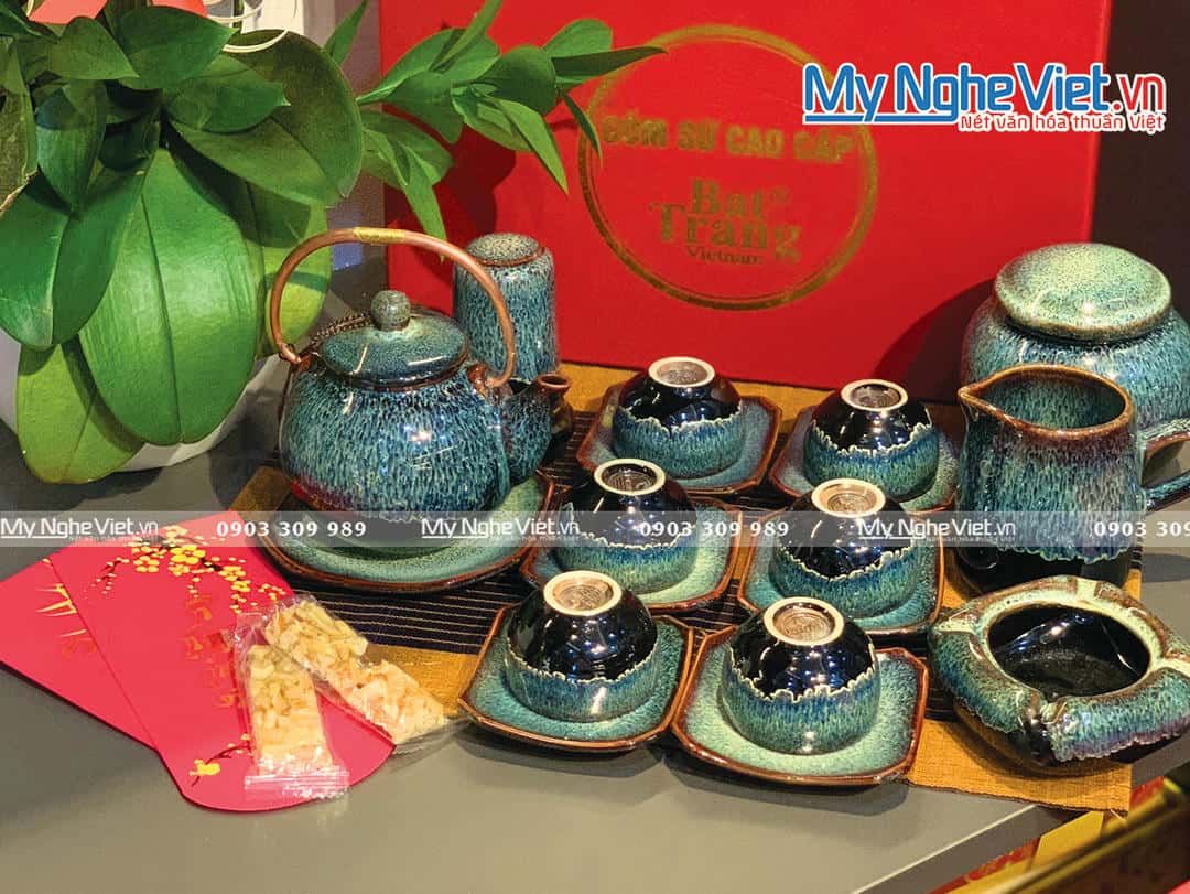 01 bình + 06 tách + 07 đĩa lót + 01 ống đựng tăm + 01 gạt tàn + 01 ly sứ + 01 hủ trà